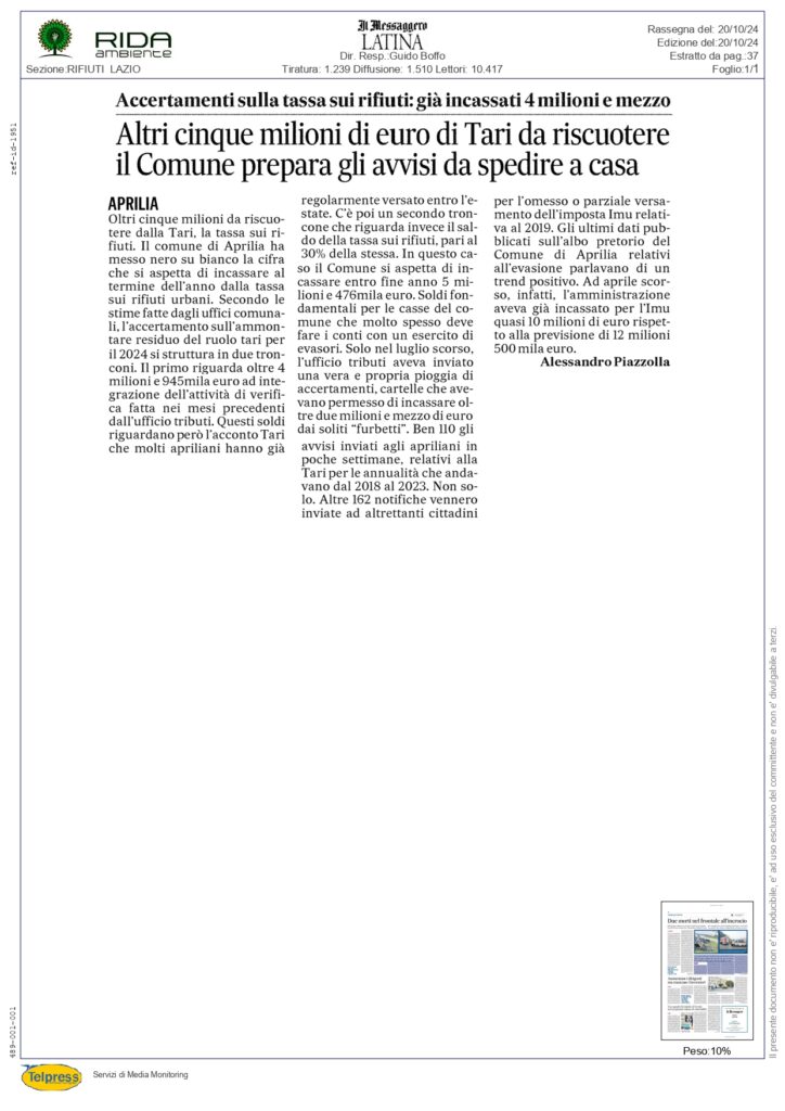 - IL MESSAGGERO: Latina, 5 milioni di euro di Tari da riscuotere, il Comune prepara gli avvisi