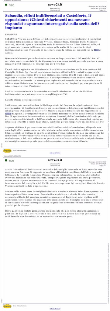 - NEWS-24 Sabaudia, rifiuti indifferenziati a Castelforte, spuntano interrogativi sulla scelta dell’impianto