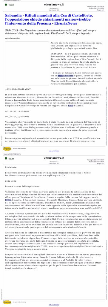 - ETRURIANEWS Sabaudia, rifiuti mandati alla Csa di Castelforte, l’opposizione chiede chiarimenti ma servirebbe l’intervento della Procura
