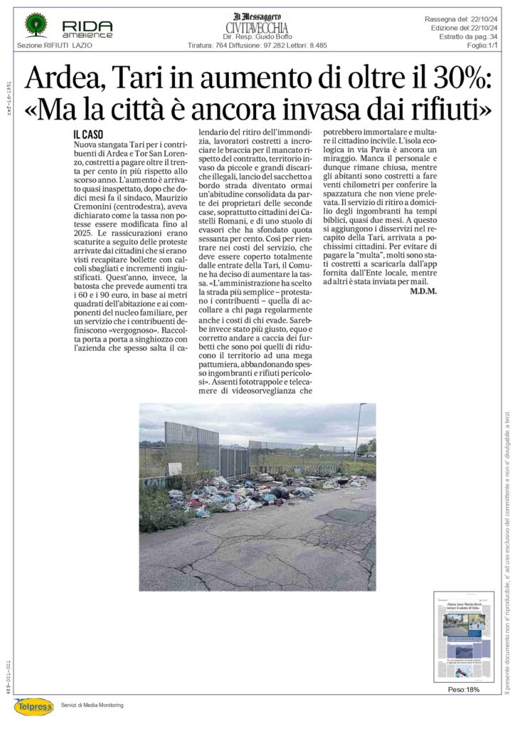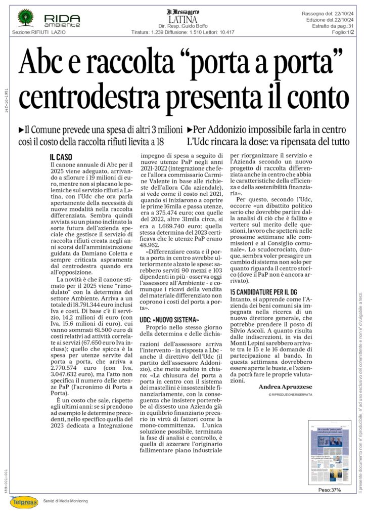 RASSEGNA STAMPA 22 OTTOBRE 2024 Data pubblicazione 22 Ottobre 2024Area Stampa IL MESSAGGERO: Latina, Abc e raccolta porta a porta, il centro destra presenta il conto IL MESSAGGERO: Ardea, Tari in aumento di oltre il 30% ufficiostampa@ridambiente.it Condividi: Facebook Twitter Google+ LinkedIn